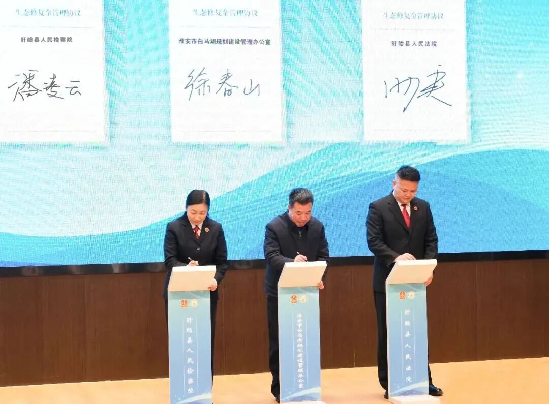 市白馬湖規(guī)劃建設(shè)管理辦公室黨組書記、主任徐春山,盱眙縣法院院長(zhǎng)田庚、盱眙縣檢察院檢察長(zhǎng)潘凌云共同簽署《生態(tài)修復(fù)金管理協(xié)議》,規(guī)范資金使用,確保“每一分錢都用在修復(fù)刀刃上”。