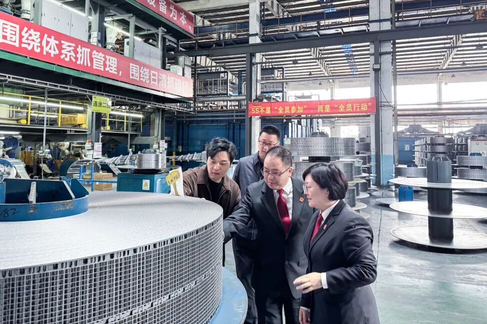 盱眙法院法官走進某能源公司生產研發一線,了解企業在電池技術創新、生產工藝升級中的司法需求,為綠色能源產業的高質量發展提供精準法治保障。