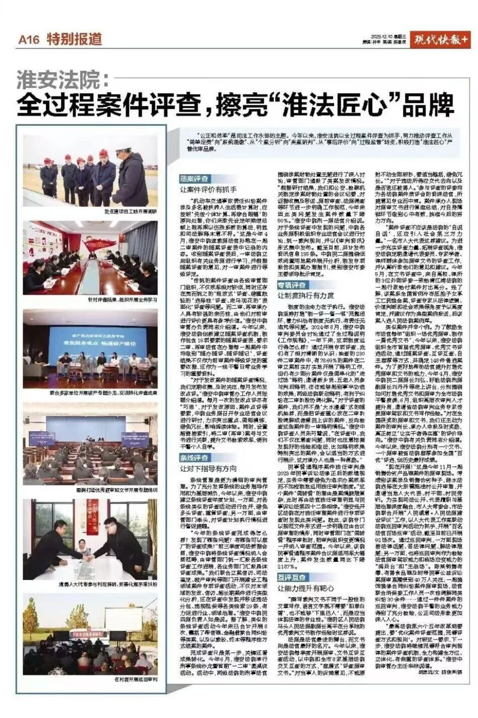 “最高法院第六個(gè)五年改革綱要提出,要‘優(yōu)化案件評(píng)查范圍,完善評(píng)查方式和規(guī)則’。對(duì)照這一要求,下一步,淮安法院將繼續(xù)完善符合審判規(guī)律的案件評(píng)查機(jī)制,全力構(gòu)建全方位、立體化、有側(cè)重的評(píng)查體系。”淮安中院審管辦主任華林說(shuō)。